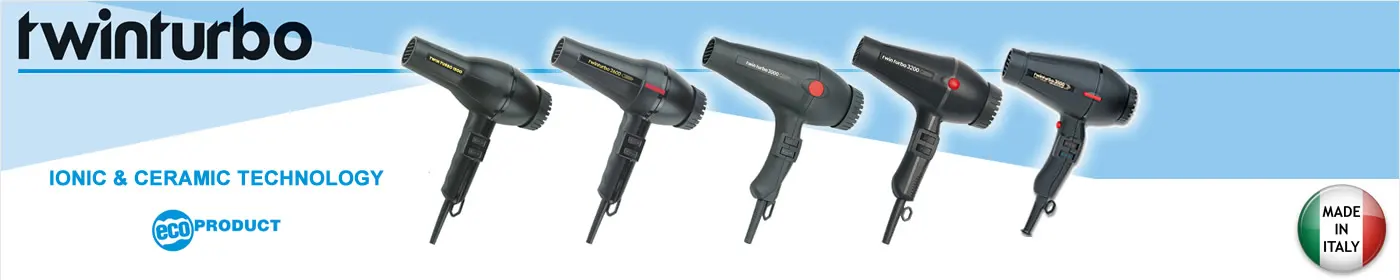 Σεσουάρ χειρός TWIN TURBO 3000. Ενισχυμένο ανθεκτικό περίβλημα. Μοτέρ αντοχής με υψηλές επιδόσεις. 1580/1810 Watt, 2 ταχύτητες, 4 θερμοκρασίες. 2 διακόπτε