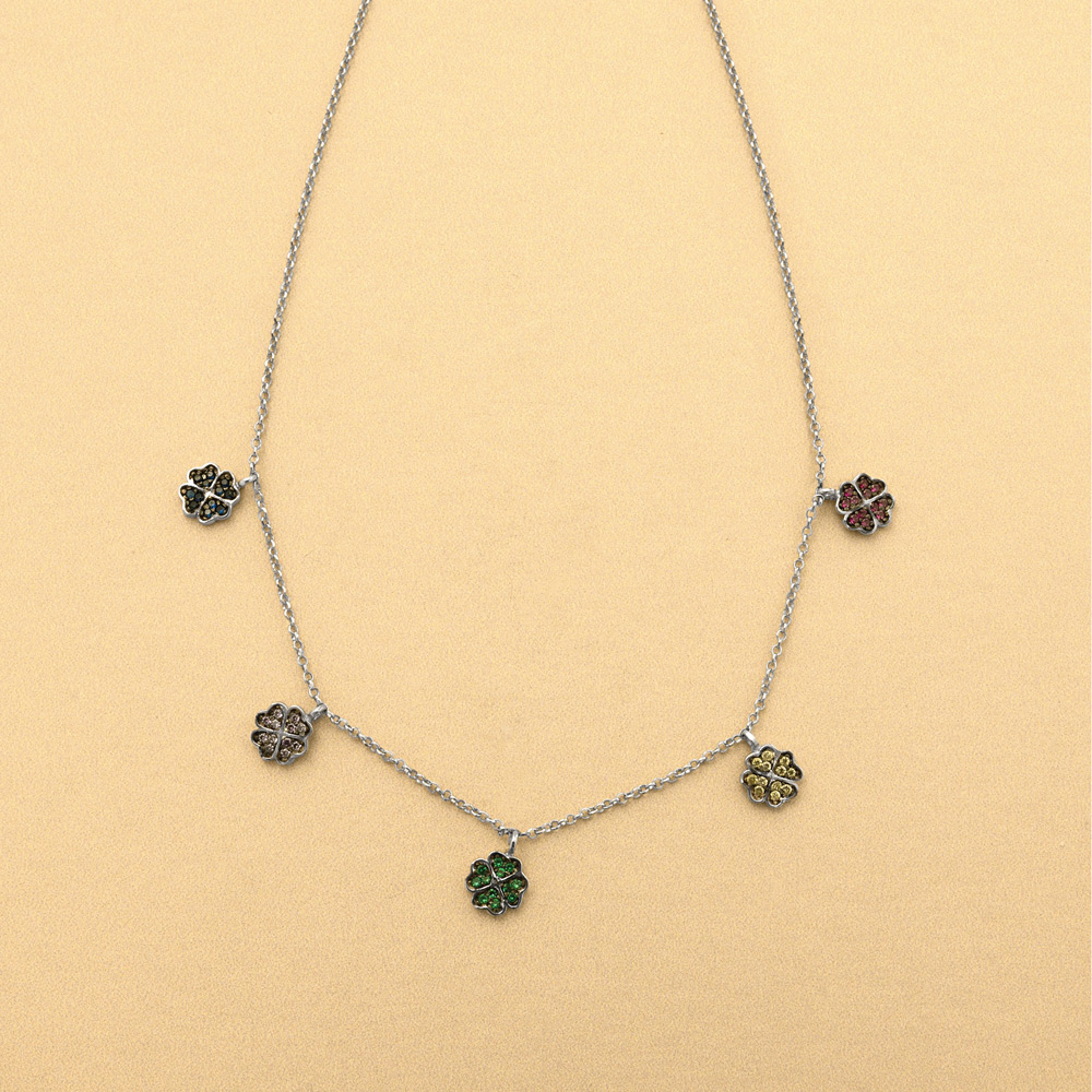 Κολιέ από επιπλατινωμένο ασήμι 925 με 5 τετράφυλλα τριφύλια με ζιργκόν σε διάφορα χρώματα.