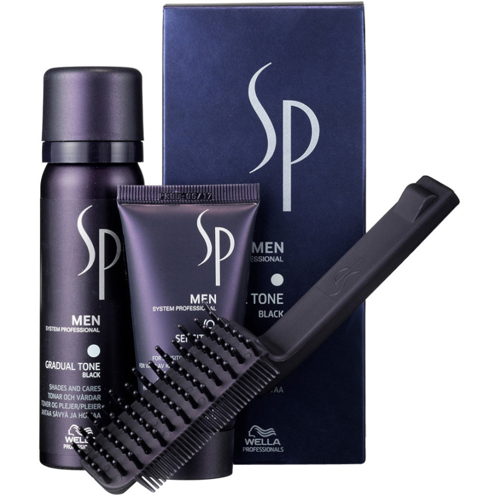 Η συσκευασία περιλαμβάνει το σπρέι αφρού, βούρτσα εφαρμογής, γάντια & σαμπουάν SP Men Sensitive Shampoo 30ml.