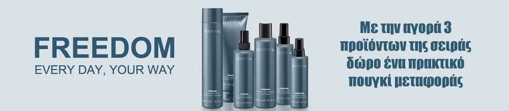 Η σειρά Freedom είναι μια πολυχρηστική και ολοκληρωμένη αγωγή της Cotril που απευθύνεται τόσο σε γυναίκες όσο και σε άντρες. Τα προϊόντα της σειράς απευθύνονται ιδιαίτερα σε όσους αγαπούν και ασχολούνται με τις έντονες δραστηριότητες που η καθημερινή ενυδάτωση, περιποίηση και υγιεινή των μαλλιών απαιτείται.