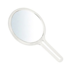 Καθρέπτης χειρός διπλής όψης με λαβή από διάφανο πλαστικό.